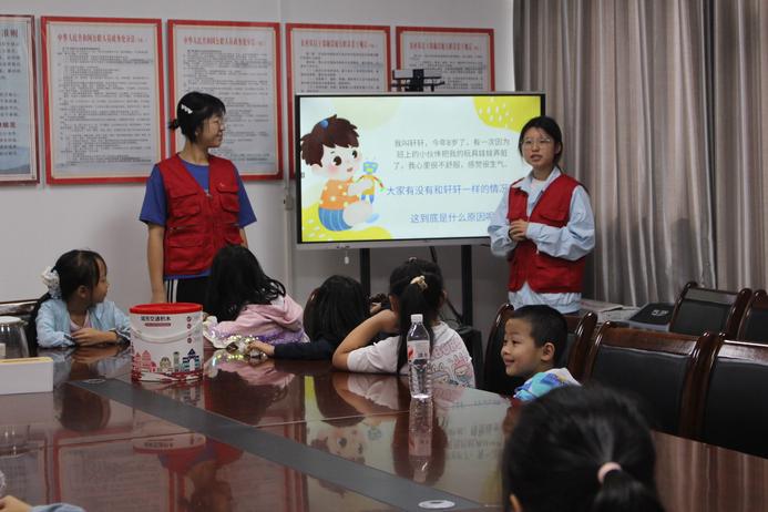 本次活动以情绪管理为核心,小先生们立足学前教育专业优势,让孩子们在玩中学、学中悟。活动伊始,由田沙沙和胡沁馨两位小先生为孩子们带来了《和情绪做朋友》科学现象活动,她们借助动画场景解读快乐、悲伤等五种基本情绪,主动引导孩子思考消极情绪的应对方法。