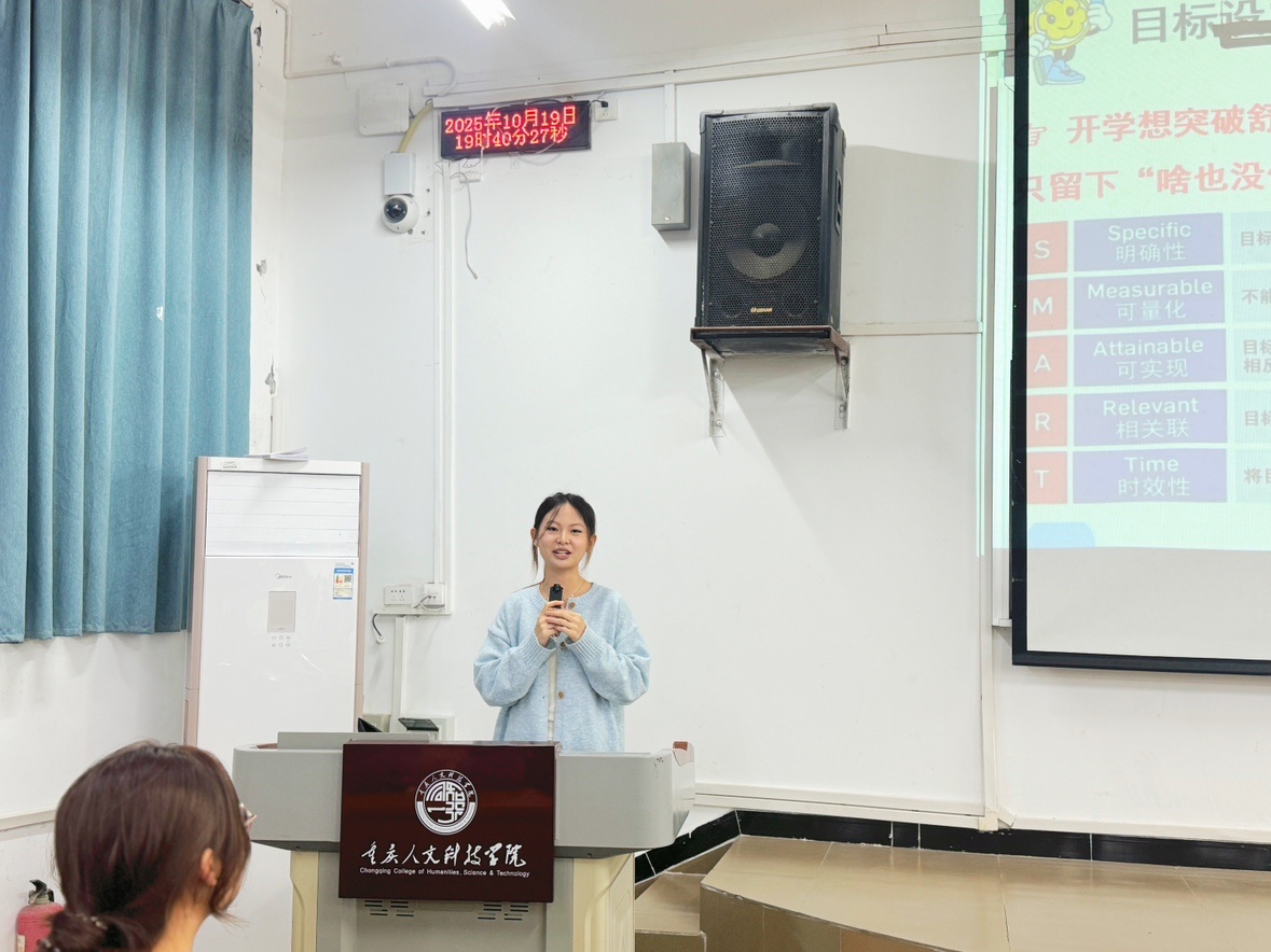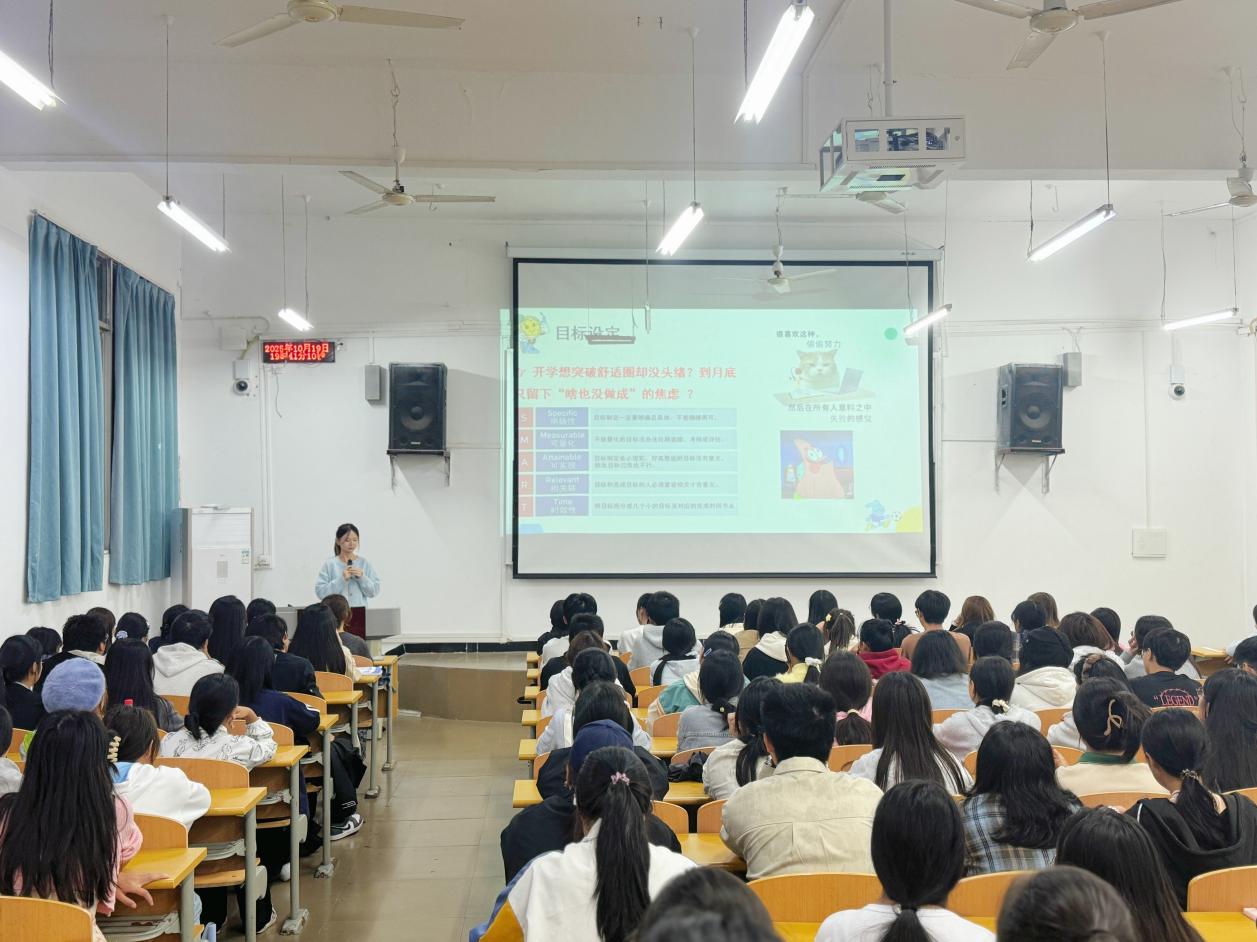分享伊始,程文雨学长以“你以为的大学vs现实中的大学”为切入点,结合自身经历,生动还原了新生们常见的“目标模糊焦虑”“上课听不懂”“作业写不完”等学业困境,瞬间引发全场共鸣。针对这些“拦路虎”,学长从目标设定、时间管理、学习方法三个核心维度,给出了简单实用的应对攻略。