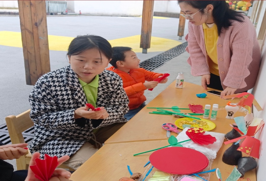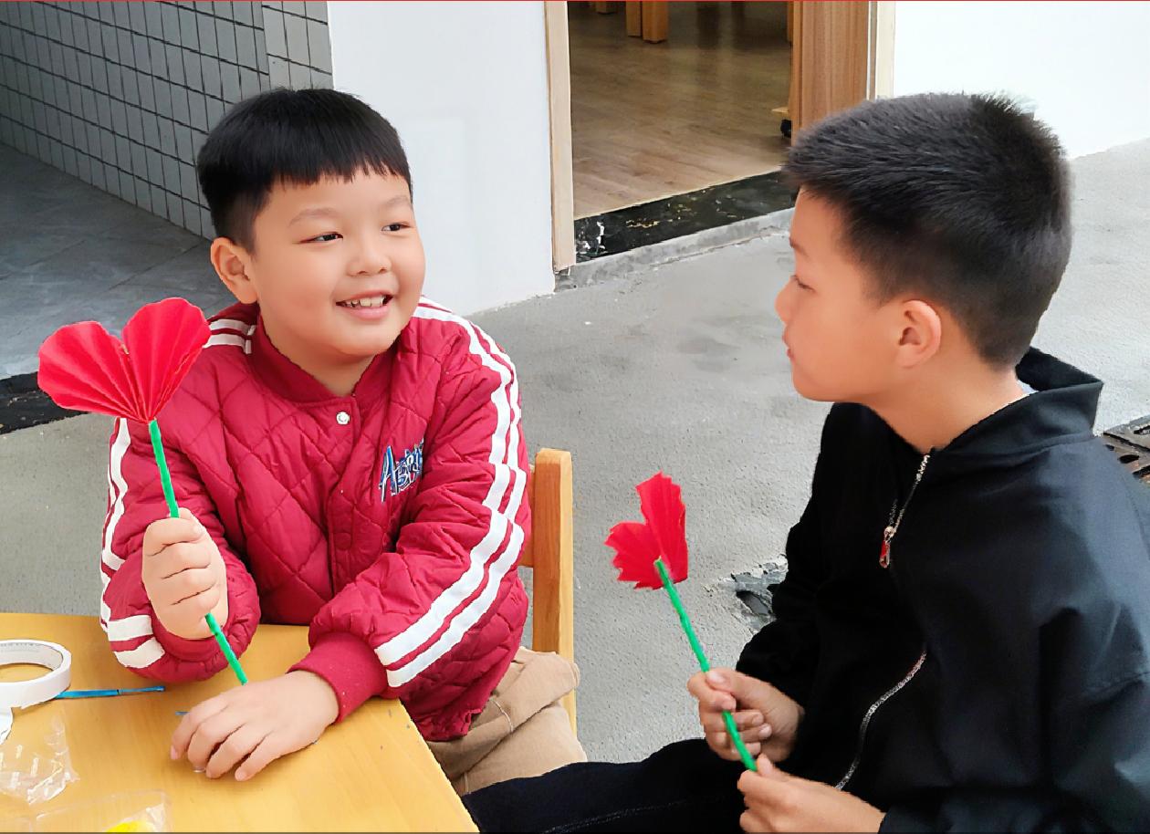 开园后,活动首站聚焦蒙学园手工坊,以《手工爱心花》制作为主题掀起“爱心传递”浪潮。“蒙学小先生”以陶行知“教学做合一”理念,用“示范—协作—创造”三阶教学法带“小小先生”掌握创作要点,然后鼓励“小小先生”为更小的小朋友示范讲解折叠技巧,引导他们观察什么是对称美,并学着尝试融入“爱国红”“生态绿”等思政元素。现场孩子们兴致勃勃,在“做中学”完成专属作品,“小小先生”模式既锻炼小朋友动手能力,也让大朋友培育责任意识与团队精神,实现双向成长。
