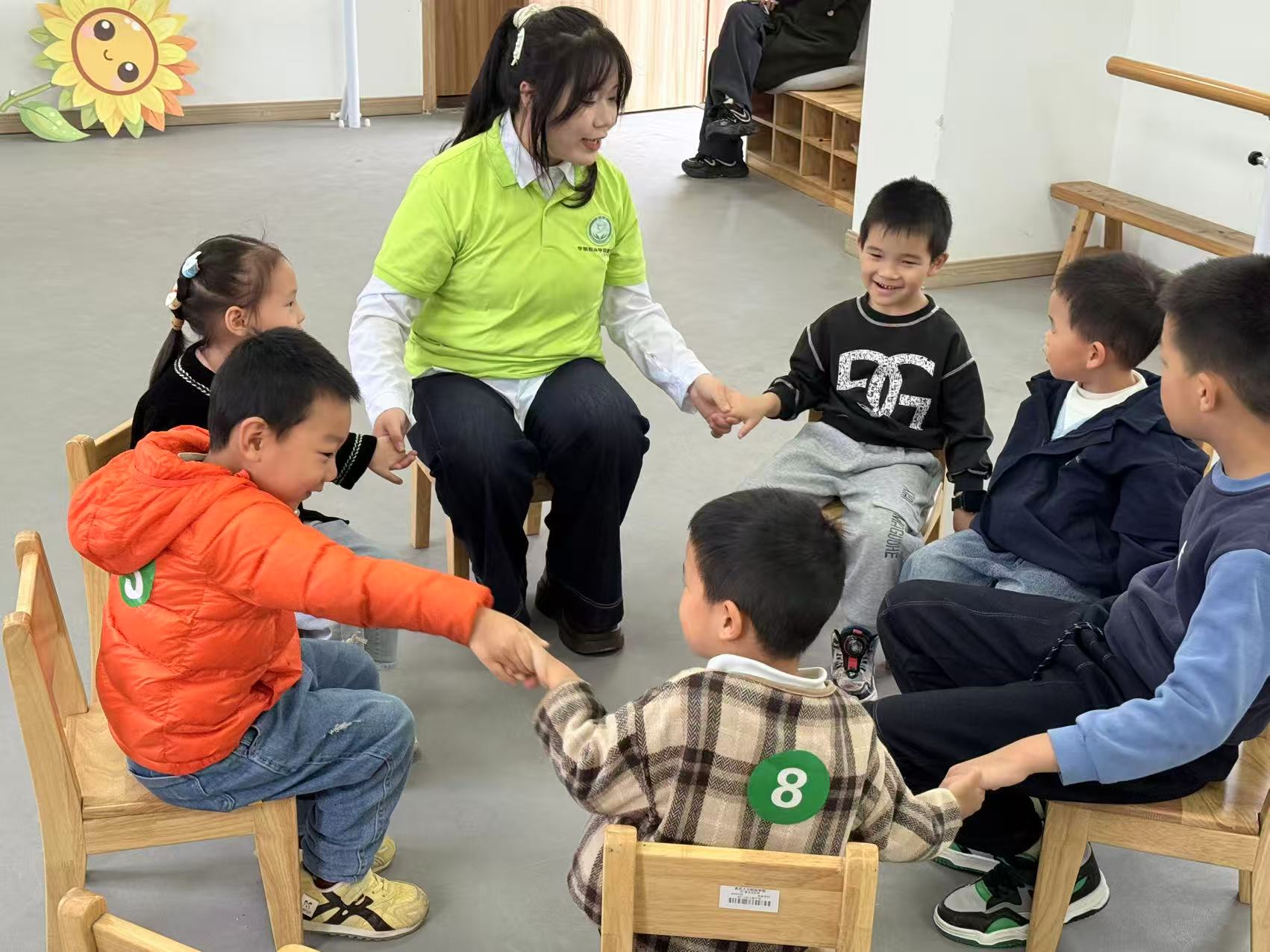 在感统馆,小先生开展了一场趣味盎然的音乐体育活动。小先生们遵循陶行之“社会即学校”的教育观,将社交能力培养融入游戏场景。“小小先生”主动牵起害羞小朋友的手围成圆圈,在互动游戏中鼓励弟弟妹妹大胆表达、积极参与。在轻松愉悦的氛围中,孩子们在大带小中逐渐打开心扉,学会表达自己、倾听他人,社交能力得到有效锻炼。通过这种沉浸式、游戏化的教学方式,不仅激发了幼儿的参与热情,更在潜移默化中培养了他们的社交技能,为其健康成长奠定了良好基础。