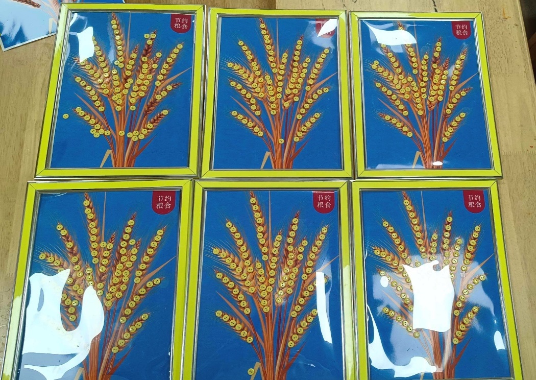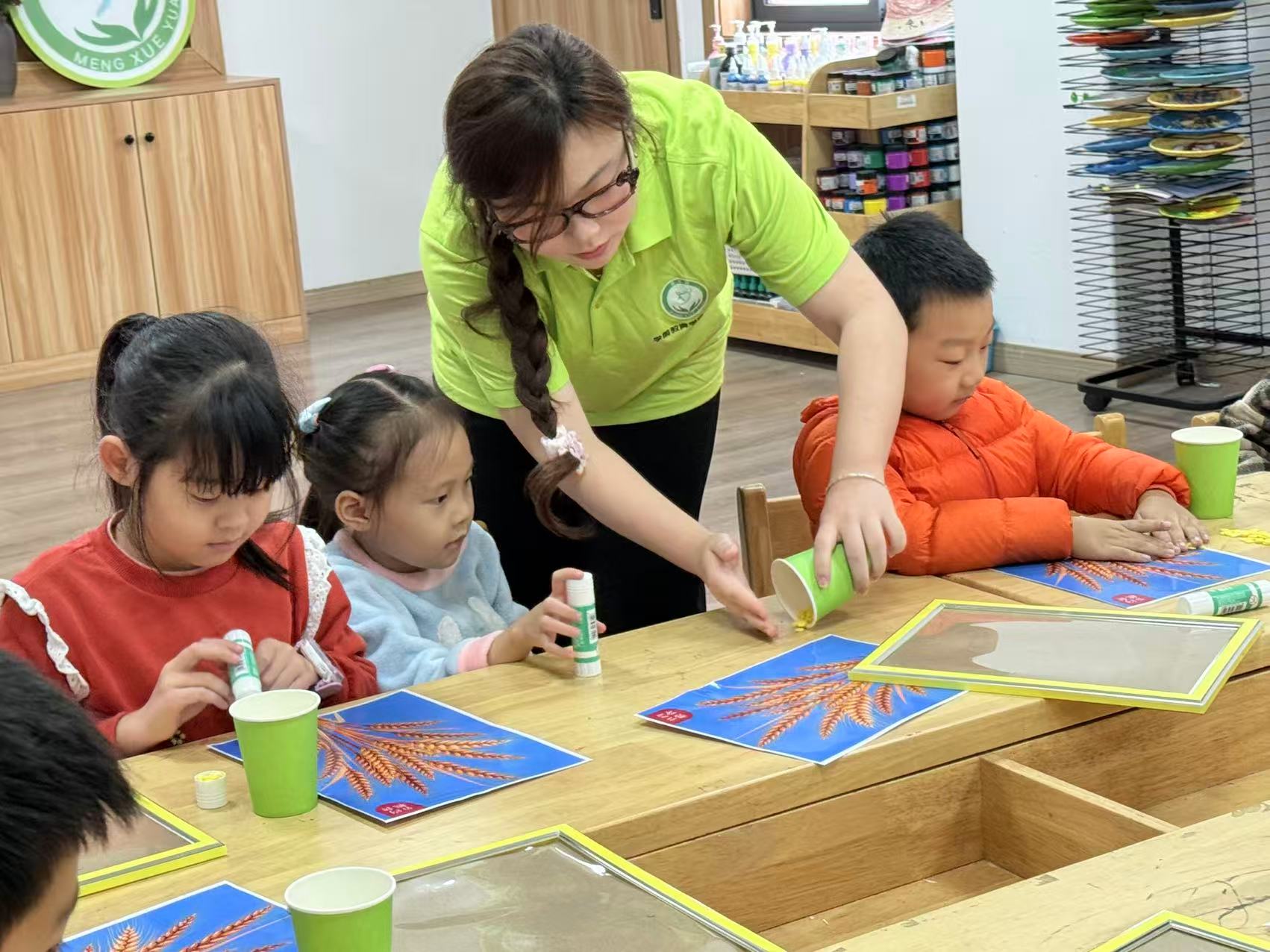 最后,美术馆“麦子纽扣贴画”主题手工活动极具创意,小先生们以“节约粮食”为德育切入点,融合艺术创作与陶行知教育精神。活动中,他们通过“讲解—示范—创作”教学闭环引导创作,“小小先生”化身“小先生的”助教,协助小朋友用黄色纽扣粘贴出金黄麦穗;完成的作品装裱后配上“节约粮食”的主题标识,成为传递中华传统美德的生动载体。孩子们在趣味手工中既享创作乐趣,又懂粮食珍贵,有效助力幼儿养成良好习惯。
