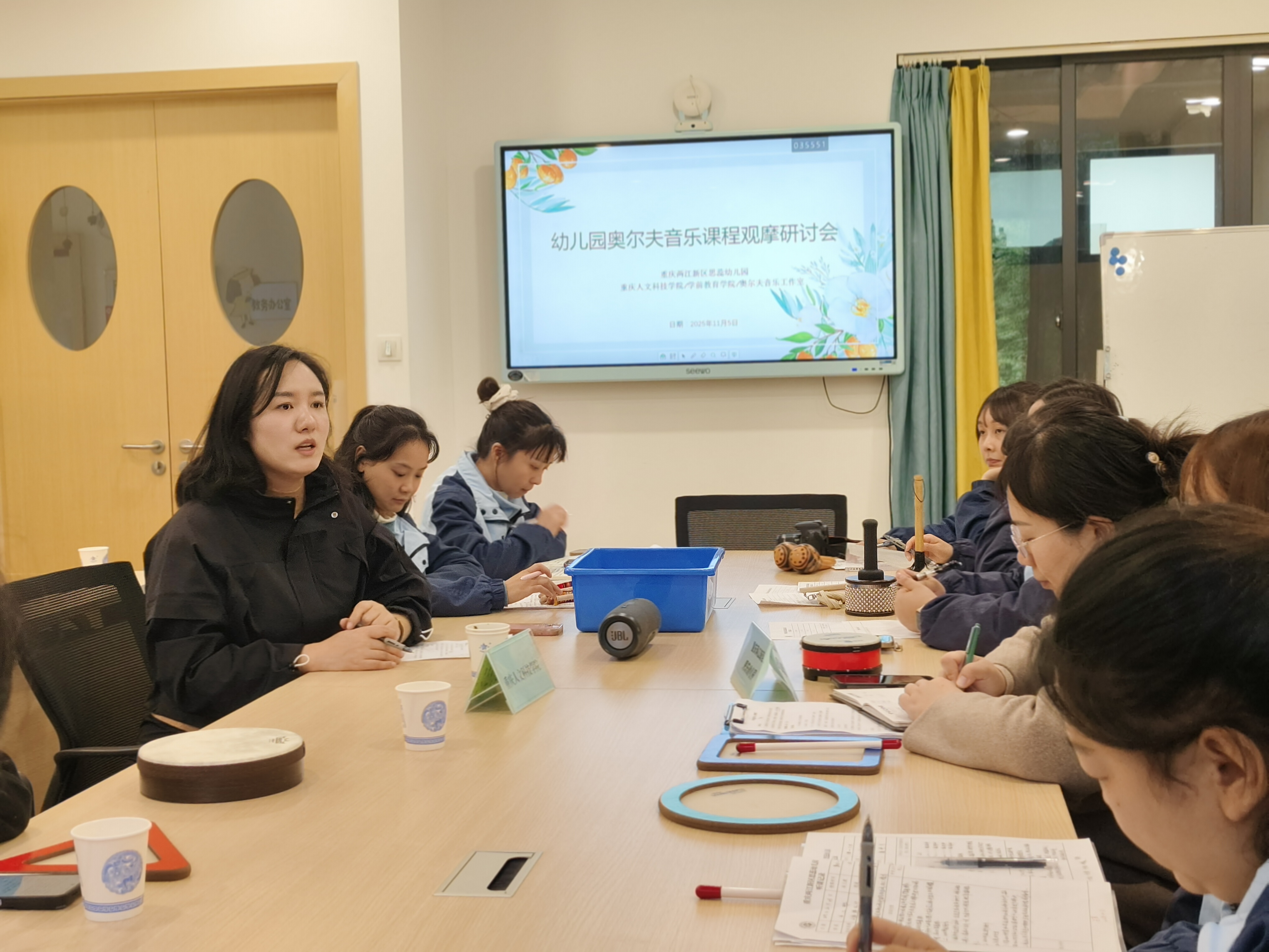 2025年11月5日,学前教育学院奥尔夫工作室师生走进两江新区思蕊幼儿园,以“实践观摩+深度研讨”的创新形式,共同开展奥尔夫音乐课程专题研讨会。此次活动聚焦幼儿园音乐教育实效提升,搭建起高校教研资源与幼儿园教学实践的精准对接桥梁,推动园校协同育人走深走实。