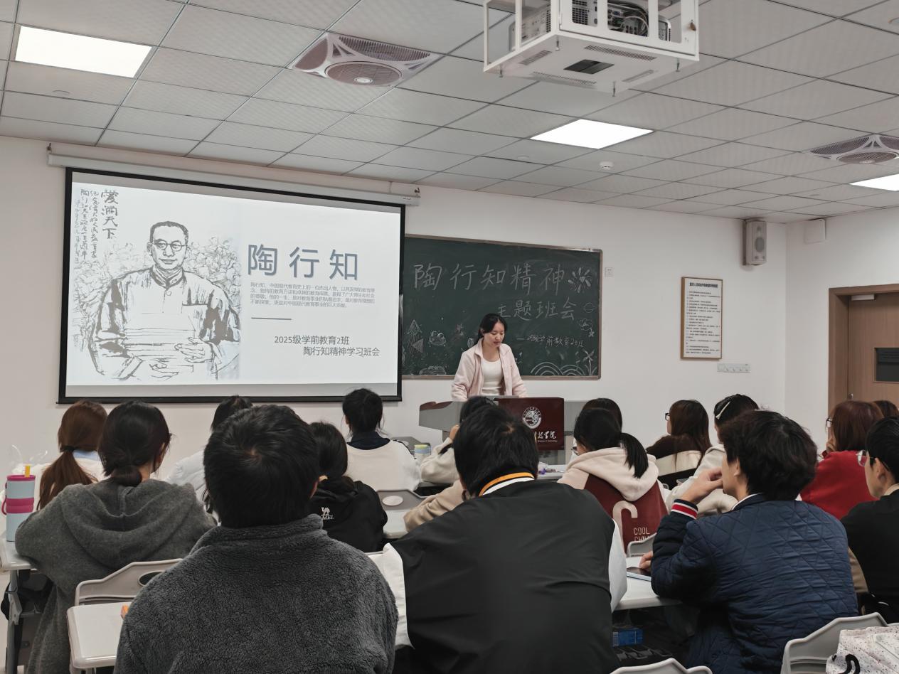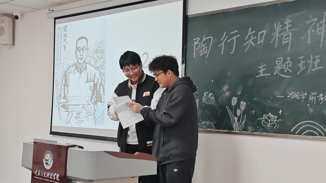 班会伊始,班长龚钰杰通过生动详实的讲述,带领同学们走进陶行知先生的教育人生。从“捧着一颗心来,不带半根草去”的无私奉献情怀,到“生活即教育”“社会即学校”“教学做合一”的先进教育理念,再到打破传统教育桎梏、扎根教育实践的探索历程,让同学们深刻体悟到教育与生活、社会的深度交融,也对自身所学学前教育专业的使命担当与价值追求形成了更清晰、深刻的认知。