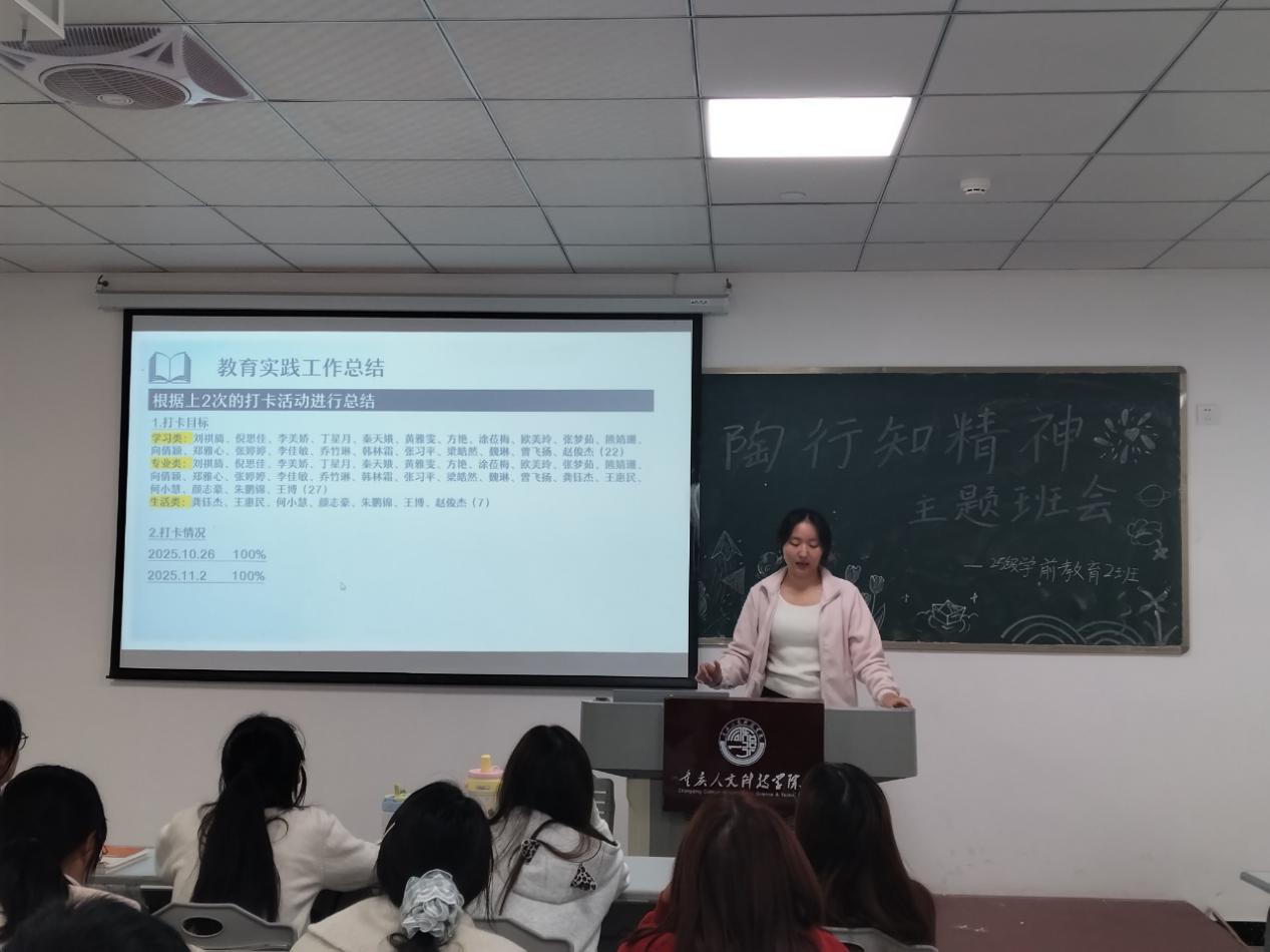 班会尾声,班长龚钰杰进行总结。她首先肯定了本次班会的成效,强调同学们不仅深入理解了陶行知精神的内涵,更明确了践行路径。随后,她针对此前开展的两周“陶行知精神打卡活动”进行复盘,详细点评了同学们在生活实践、专业学习等方面的打卡成果,既肯定了大家“内化于心、外化于行”的自觉,也提出了针对性改进建议。她号召全班同学以陶行知先生为榜样,将精神力量转化为实际行动,在专业学习中求真知,在生活实践中练本领。