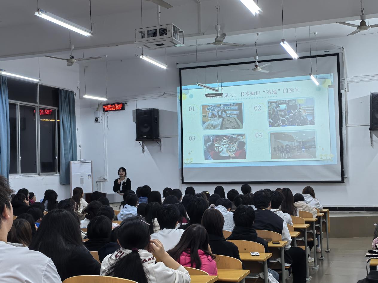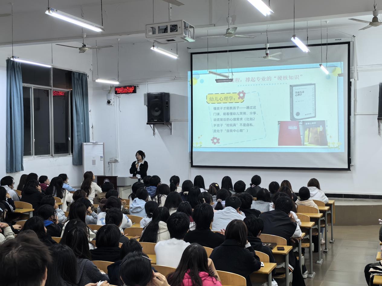 为帮助大一新生打破学前教育专业的传统印象,精准把握专业内涵,快速搭建行之有效的学习框架,2025年11月9日,学前教育学院2025级“导航学长话成长”系列分享活动第四场在博文楼1101教室顺利举行.本次分享由2025级学前教育2班导航学长吴孝红主讲,主题为“学前教育专业初体验——那些你不知道的专业小知识”,辅导员陈薇老师与2025级学前教育1-5班全体新生共同参与。