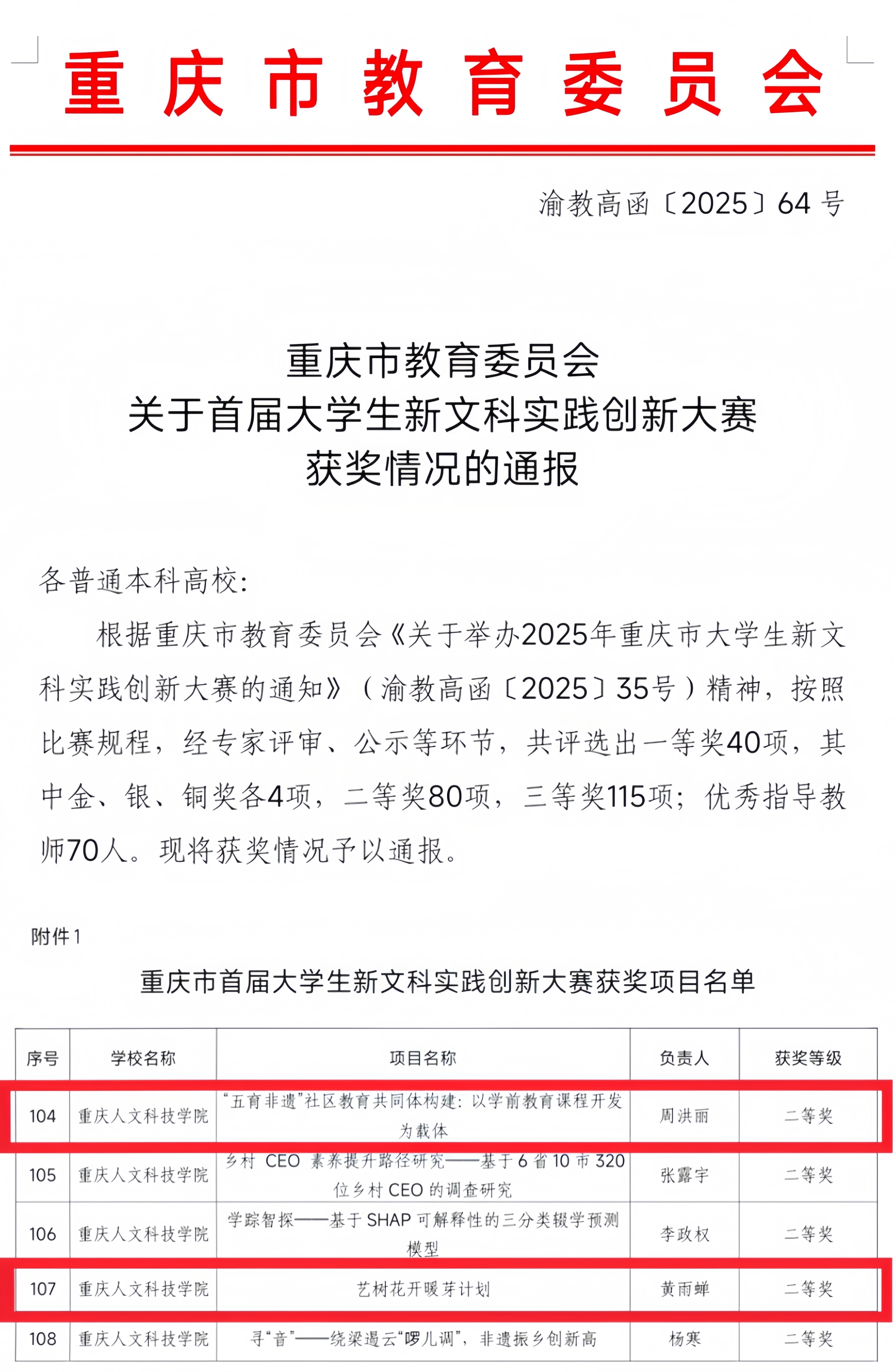 在重庆市首届大学生新文科实践创新大赛中,学院两支参赛队伍过关斩将,均荣获市级二等奖。其中,由覃莉、罗英等两位教师指导,周洪丽同学担任负责人的团队获奖作品《“五育非遗”社区教育共同体构建:以学前教育课程开发为载体》,聚焦“五育并举”与非遗传承的深度融合,以学前教育课程开发为核心突破口,探索社区教育共同体建设的有效路径,为非遗文化的当代传承与学前教育的创新发展提供了可借鉴的实践范式。另一支由裴亮、张晓东教师指导,黄雨蝉同学带领的团队获奖作品《艺树花开暖芽计划》,围绕艺术教育赋能儿童成长展开实践探索,通过构建丰富多元的艺术活动体系与创新教育模式,为儿童艺术启蒙与全面发展提供了独特解决方案,彰显了团队在新文科实践中的创新思维与实干精神。