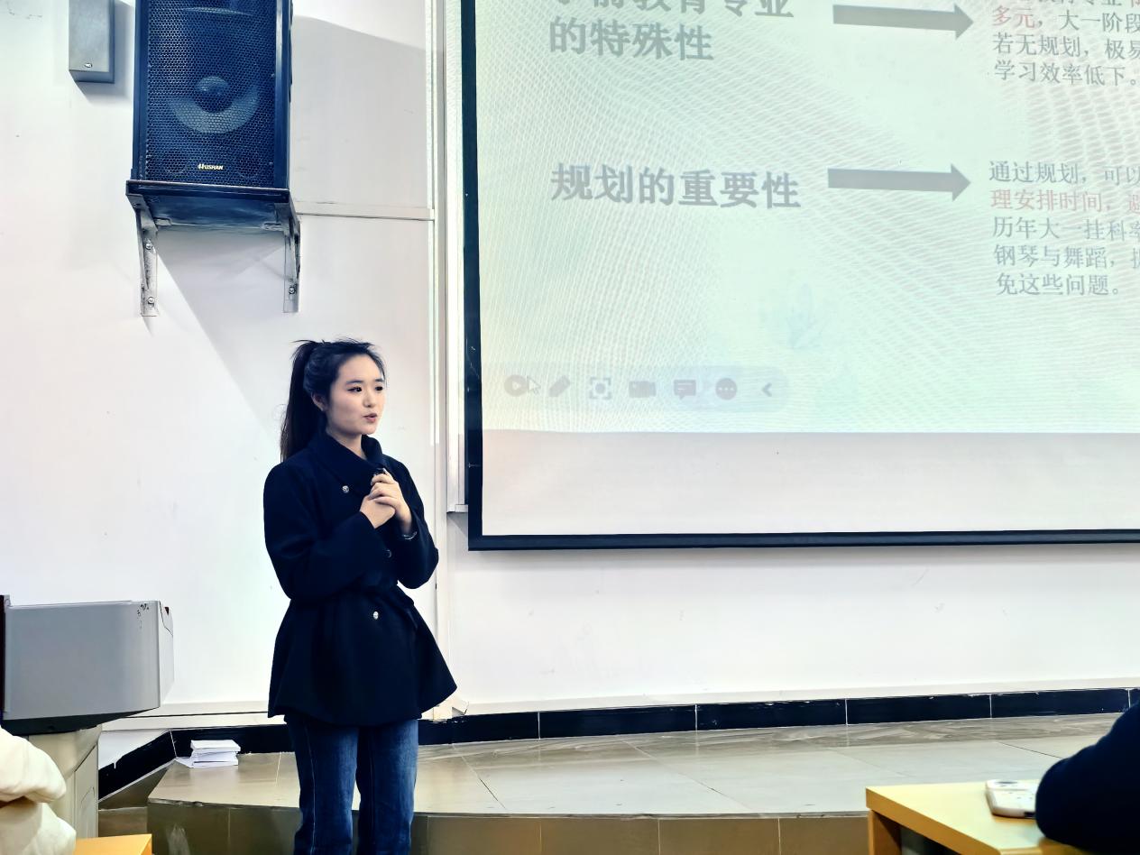 分享伊始,朱秋霞学长以自身成长轨迹为切入点,真情讲述了从“专业迷茫”到“方向笃定”的蜕变历程。她坦言,初入大学时,面对学前教育专业“理论与技能”的双重培养要求,既要攻克教育学、心理学等理论知识,又要从零起步练习钢琴、舞蹈、绘画等专业技能而陷入手足无措。但“成为有温度的幼教人”的初心,让她主动打破困境——结合专业特色将长远目标拆解为“考取幼儿园教师资格证”“通过英语四六级”“夯实技能基础”等阶段性目标,再细化为月度、周度及每日可落地的具体任务,为新生提供了可复制、可操作的目标管理范本。
