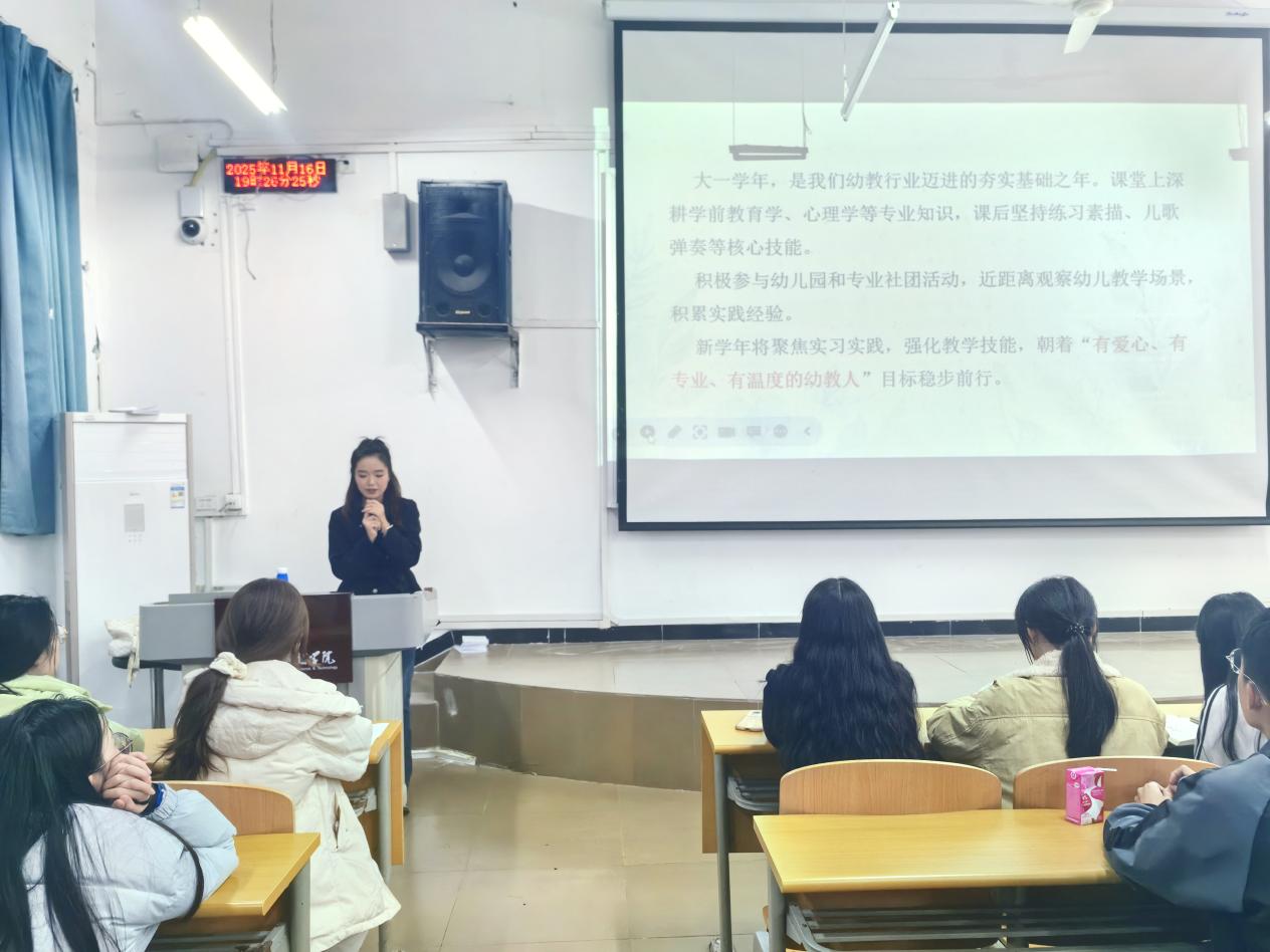 为帮助2025级新生破解入学迷茫、锚定成长方向,筑牢专业发展根基,2025年11月16日晚,学前教育学院2025级学前教育1-5班在博文楼1101教室开展“导航学长话成长”系列专题分享最后一场活动。本次分享以“从‘迷茫’到‘清晰’,破圈重塑价值,专业点亮童心”为主题,由2025级学前教育5班导航学长朱秋霞主讲,辅导员陈薇老师与2025级学前教育1-5班全体同学共同参与,为系列活动画上圆满句号。