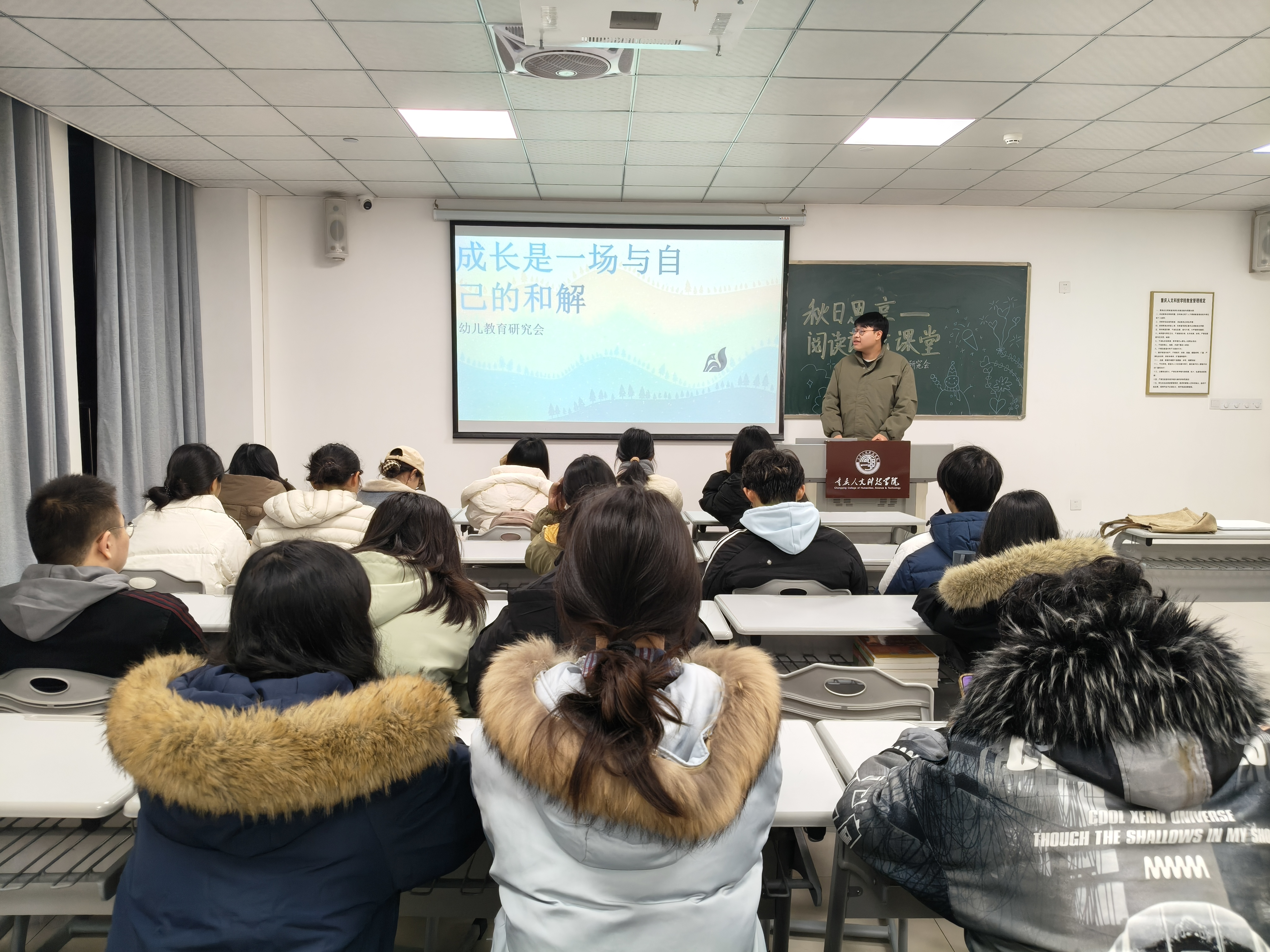 作为红岩五色服务系列活动之一,2025年12月4日,庠园一舍特设党支部联动幼儿教育研究会,于十五教1006教室温情开启“百花艺苑・匠心课堂”第二季第五期——“秋日思享・阅读讨论课堂”。本次活动由唐健茗主持,部分学前教育专业学子与庠园片区其他专业学生共同参与,旨在引导大家领悟接纳不完美、释怀遗憾的成长本质,实现对自我的深度探索与理解,在心灵成长中传承红色初心。