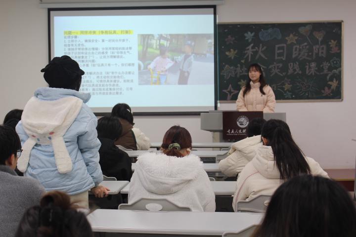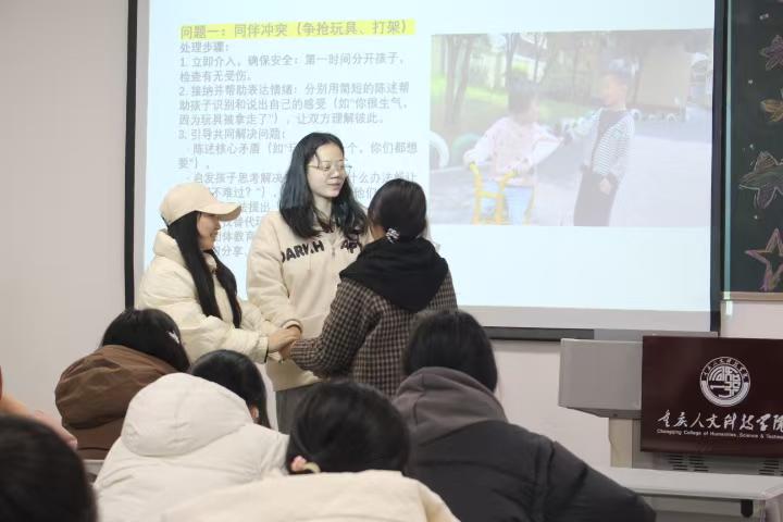 除身体安全防护外,课堂还深度贴合幼儿教育实际,围绕“同伴冲突”“情绪崩溃”“注意力不集中”等常见问题,系统讲解“情绪命名——安全宣泄——事后连接”的科学引导策略。主讲人强调,教育者需保持自身情绪稳定,通过共情倾听与正向引导,帮助幼儿学会表达与管理情绪。现场还设置情景演绎环节,邀请同学们上台模拟幼儿教育场景,并针对性解答支教过程中遇到的实操难题,指导大家通过赋予角色、优化座位布局、设计互动环节等方式,提升幼儿课堂参与感,尊重个体学习差异,充分践行“以幼儿为中心”的教育理念与人文关怀。