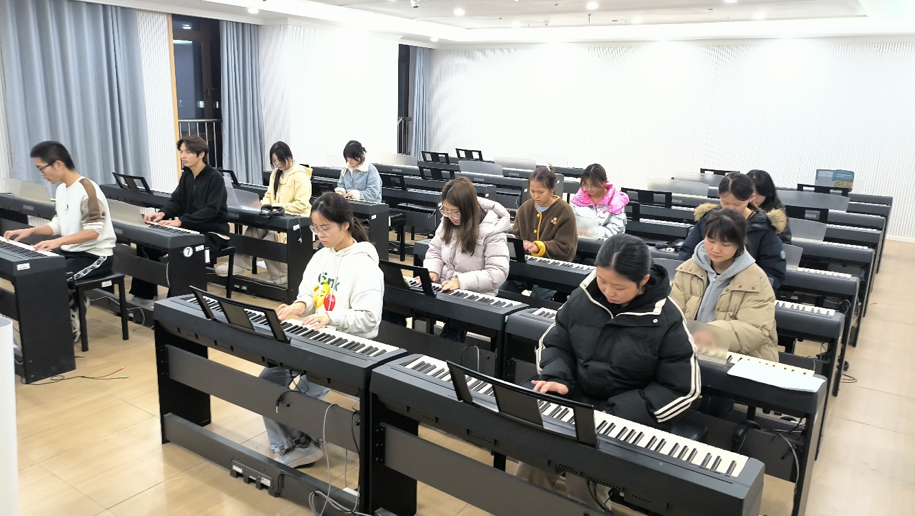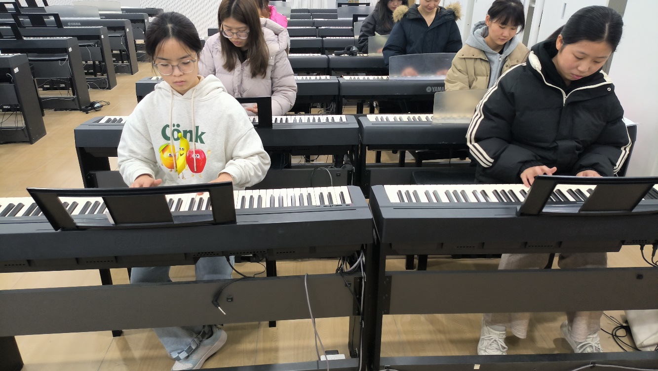 实操展示环节中,新生们积极运用所学知识与技能,纷纷上台展示学习成果:有的独立弹奏《茉莉花》悠扬旋律,有的分组配合练习音阶转换,有的尝试合奏经典曲目片段,现场氛围热烈有序,充分展现了“即知即学、即学即练”的良好学习状态。
