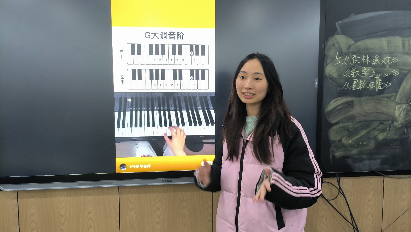 随后,肖静怡同学聚焦音阶弹奏与弹唱技巧展开教学。她细致拆解C大调、G大调音阶的指法规整,着重强调均匀触键、手臂带动与节奏稳定的核心要点,引导新生分组开展实操练习;同时选取《茉莉花》《大鱼》等经典曲目,深入剖析旋律节奏特点与情感内涵,通过现场示范、分段指导、左右手分解练习等方式,帮助新生循序渐进掌握弹唱技巧,最终实现完整曲目简谱的弹唱配合。