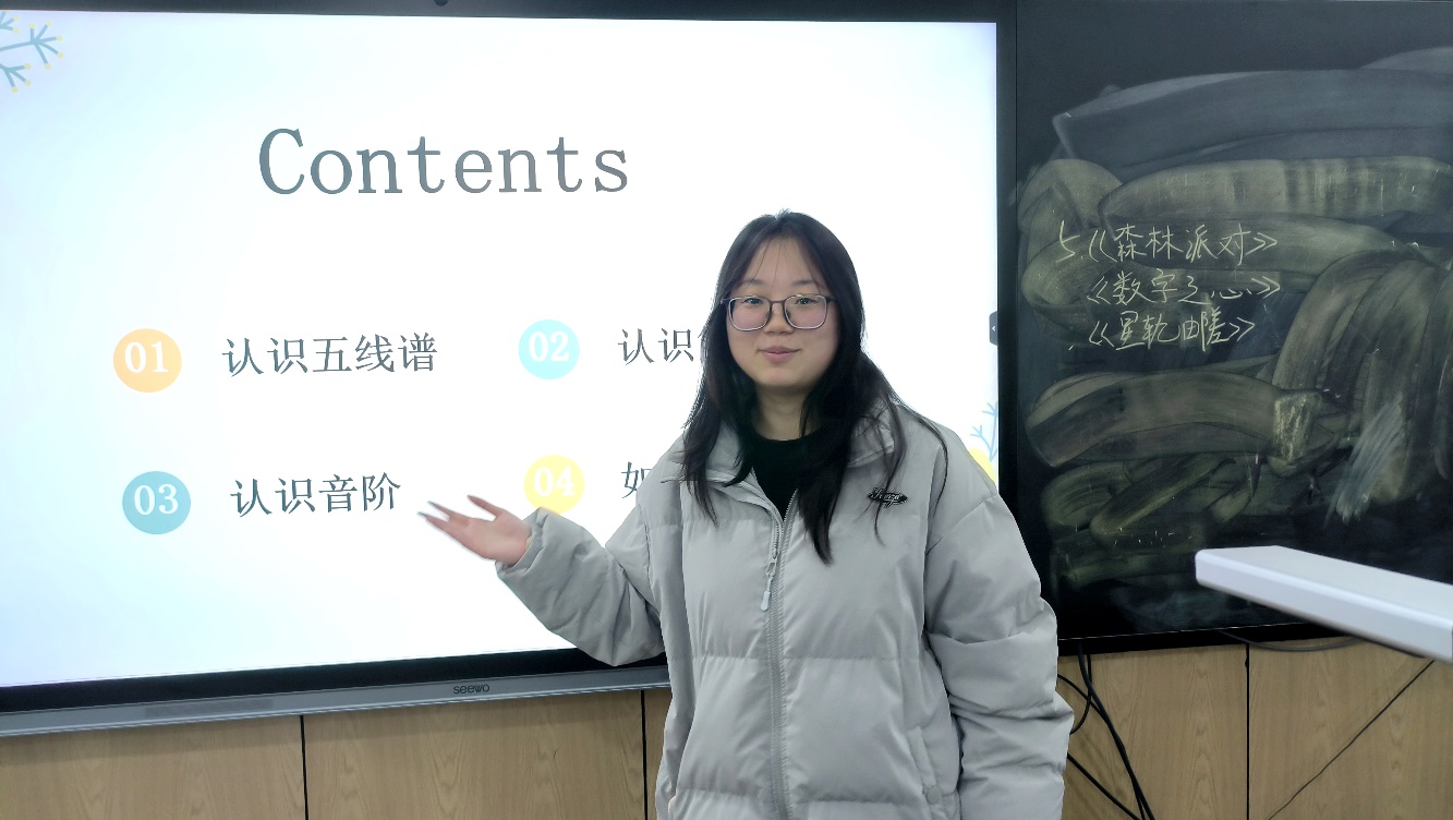 课堂上,余巧智同学以基础识谱为切入点,系统讲解五线谱与简谱的核心知识点,包括调号、拍号、音符、小节等基础概念。为帮助新生快速巩固所学,她设计了《大鱼》《欢乐颂》等经典曲目片段的识谱小挑战,通过“理论讲解+实践演练”的方式,让同学们在趣味互动中掌握基础识读方法,逐步实现简单乐谱的认唱与辨识。