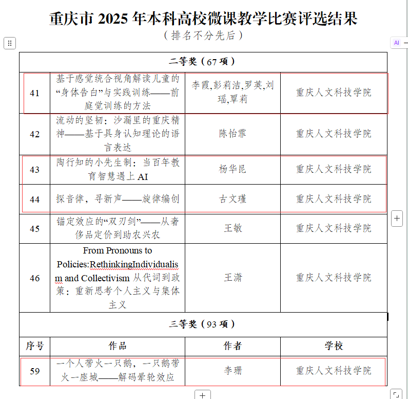 近日,重庆市2025年本科高校微课教学比赛评选结果正式揭晓,我院李霞、杨华昆、古文瑾、李珊四位教师从全市众多参赛作品中脱颖而出,荣获3项二等奖、1项三等奖的优异成绩,创下学院在该项赛事中的历史新高,充分彰显了我院教师队伍过硬的教学素养与育人实力。